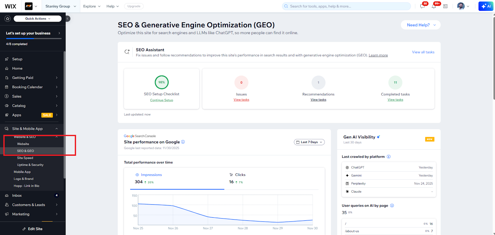 Within the SEO panel, Wix has a built-in AI SEO Assistant that runs a quick on-page audit and provides suggestions to help you optimize each page for search engines.
